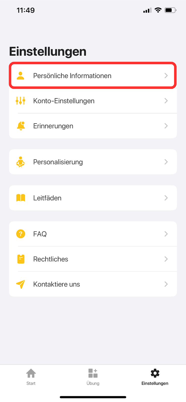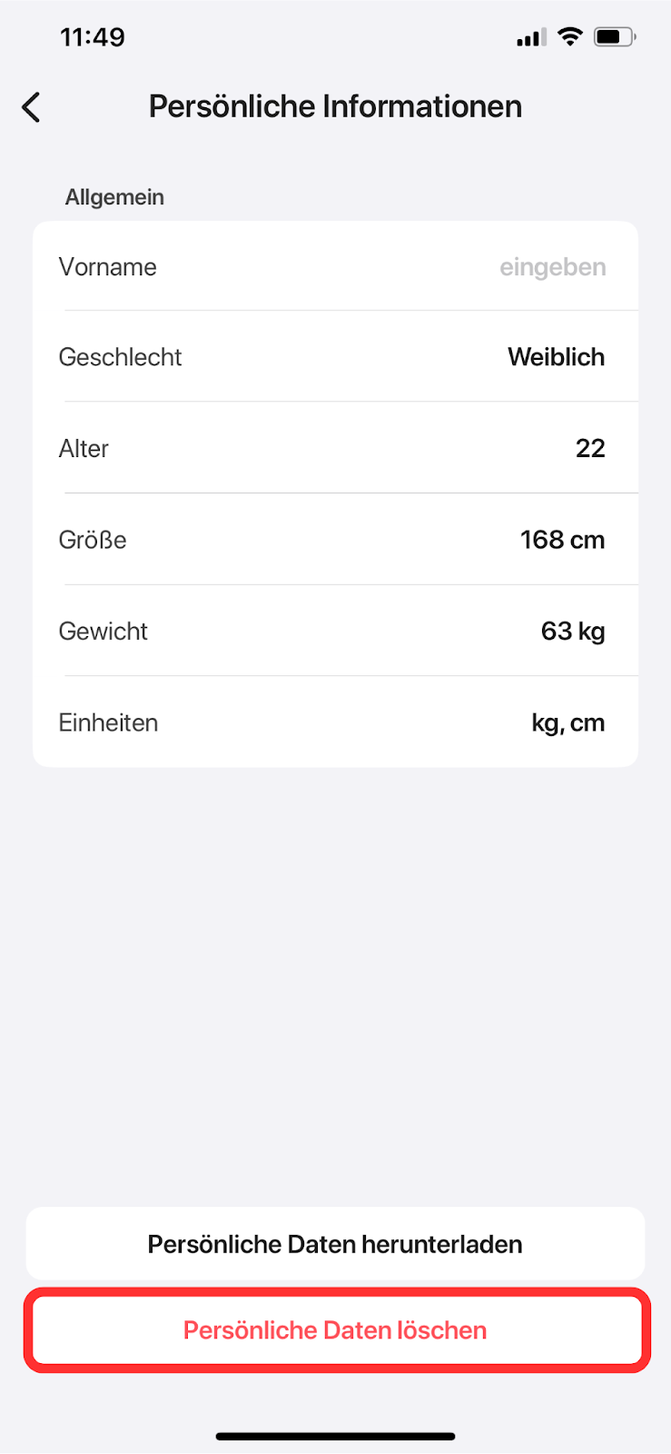 Um Ihre persönlichen Daten zu löschen, gehen Sie bitte in der App auf die Registerkarte "Einstellungen" und klicken Sie auf die Schaltflächen "Persönliche Informationen"