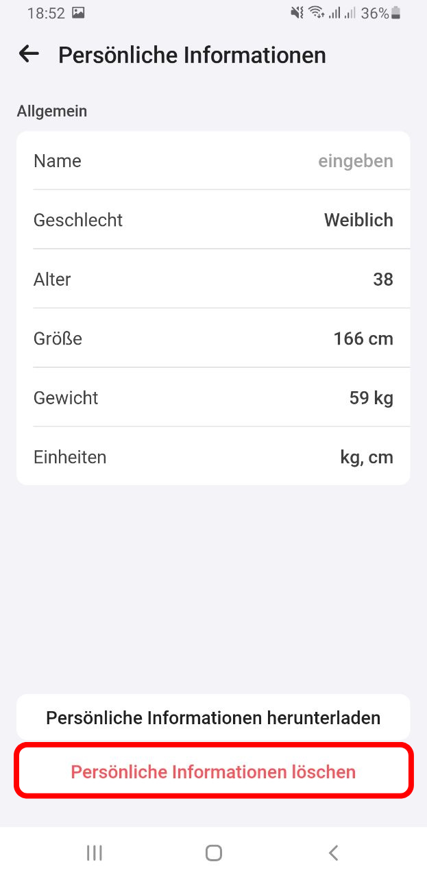 Um Ihre persönlichen Daten zu löschen, gehen Sie bitte auf die Registerkarte 'Einstellungen' und klicken Sie auf die Schaltflächen 'Persönliche Informationen'