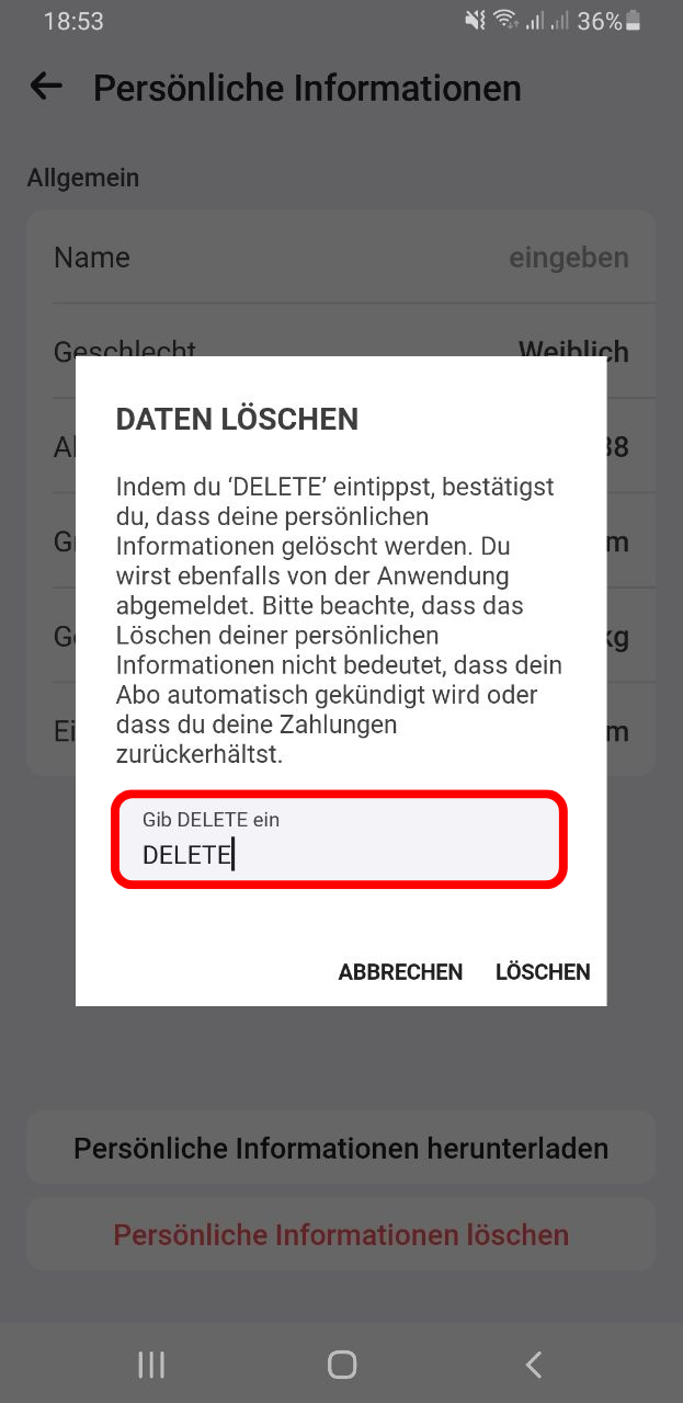 Bitte beachten Sie, dass die Löschung der persönlichen Daten zur Kündigung des Abonnements führt. Außerdem möchte ich Sie darauf hinweisen, dass Sie, wenn Sie die App bis zum Ende des Abrechnungszeitraums weiter nutzen möchten, sich an das Support-Team wenden sollten, damit Sie wieder Zugriff auf Ihr Konto erhalten.