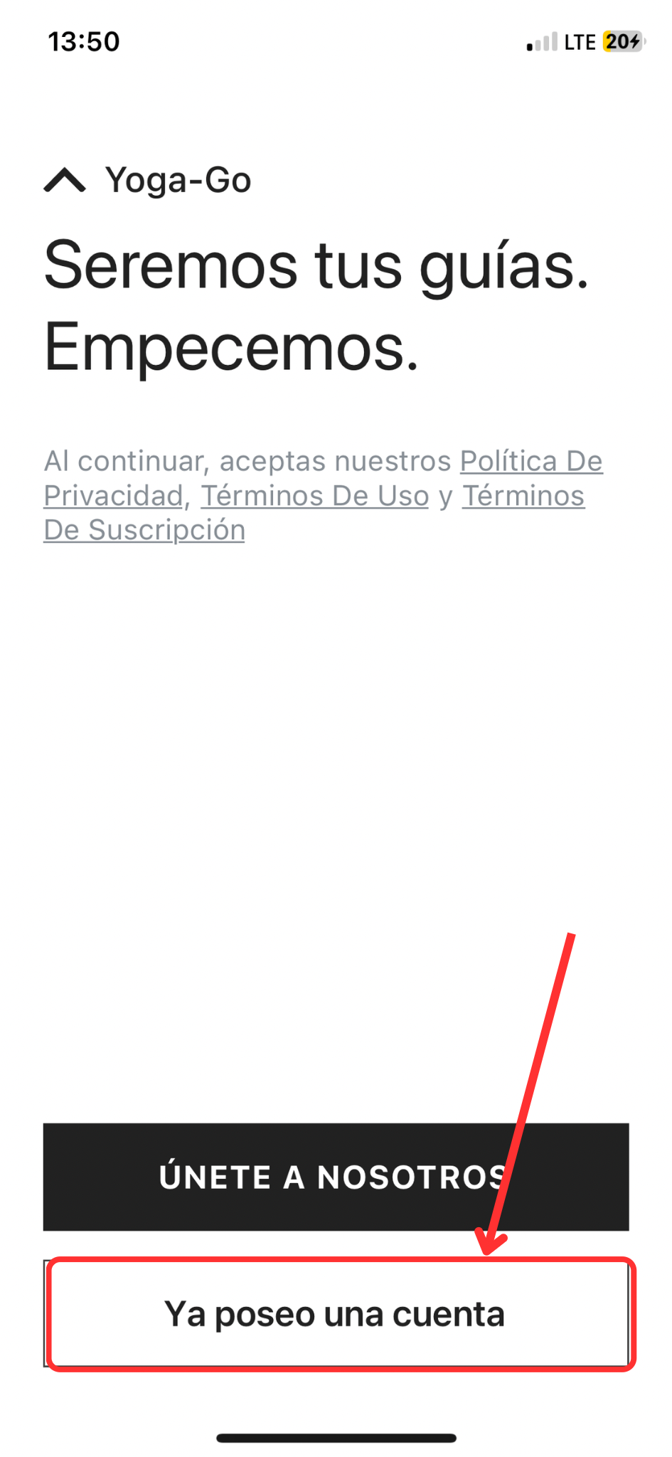 2. Abre la app y haz clic en el botón "Ya poseo una cuenta" en la primera pantalla de la app, como se muestra a continuación: