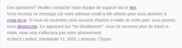 Si vous ne souhaitez plus recevoir d'e-mails de notre part, vous pouvez vous désinscrire en bas de l'e-mail en utilisant le lien hypertexte ‘se désabonner’, comme indiqué ci-dessous :