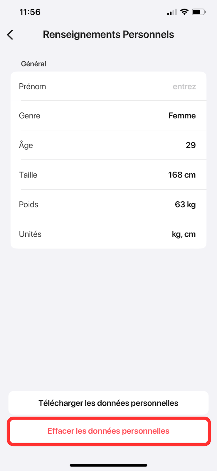 Pour supprimer vos données personnelles, veuillez vous rendre dans l'onglet "Paramètres" de l'application et cliquer sur les boutons "Renseignements personnelles"