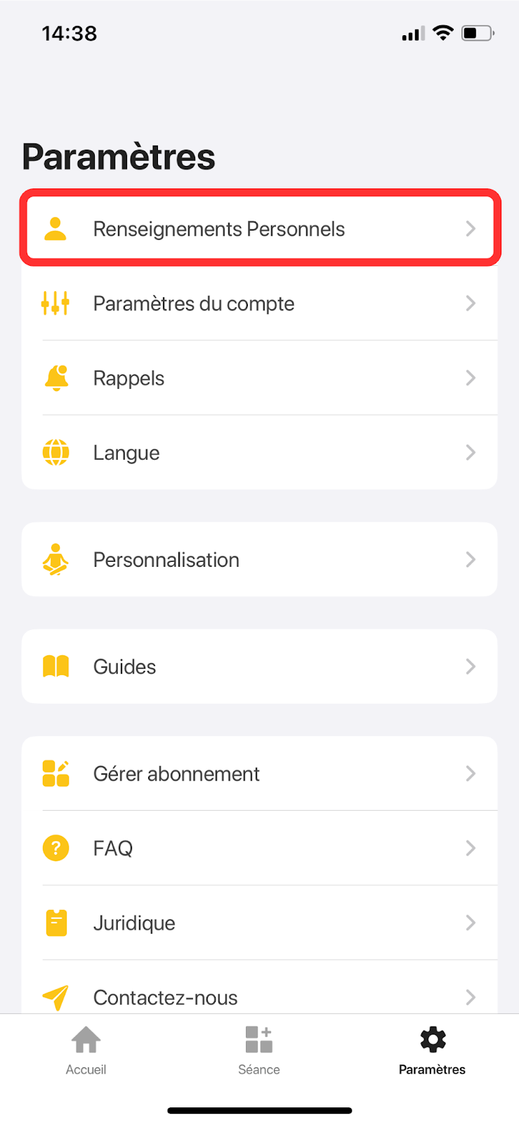 Cliquez sur le bouton “Paramètres”, puis ouvrez “Renseignements Personnels”. Ici, vous pourrez modifier votre taille, votre poids et vos unités.