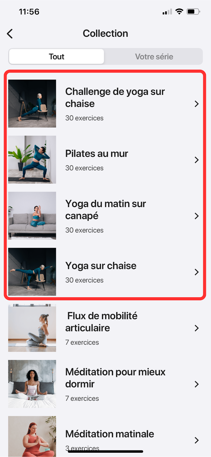 De plus, nous avons récemment mis à jour notre programme avec de nouveaux entraînements de yoga sur canapé, de yoga sur chaise, pilates mural et yoga paresseux conçus principalement pour les personnes âgées ou les débutants en yoga. Pour les trouver, suivez les instructions ci-dessous :
