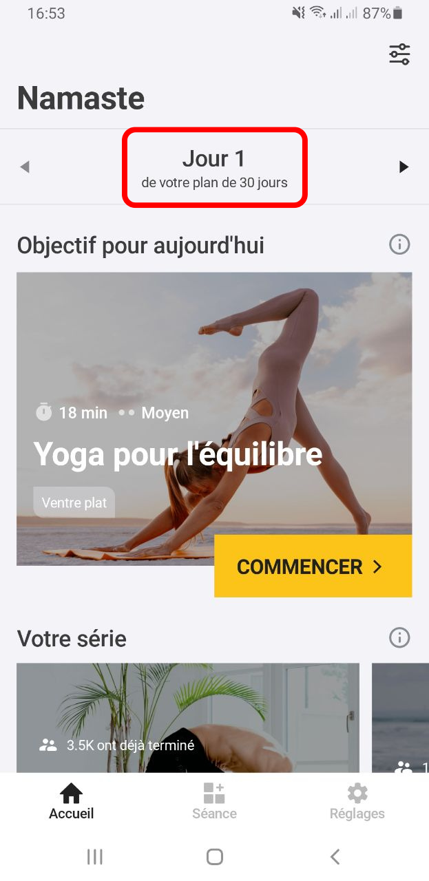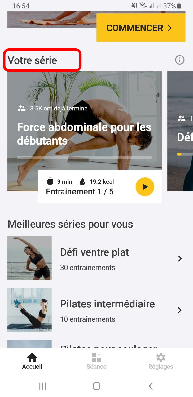 De plus, l'application vous permet de suivre votre progression dans chaque challenge ou série d'entraînements dans l'onglet "Votre série", comme le montre la capture d'écran ci-dessous: