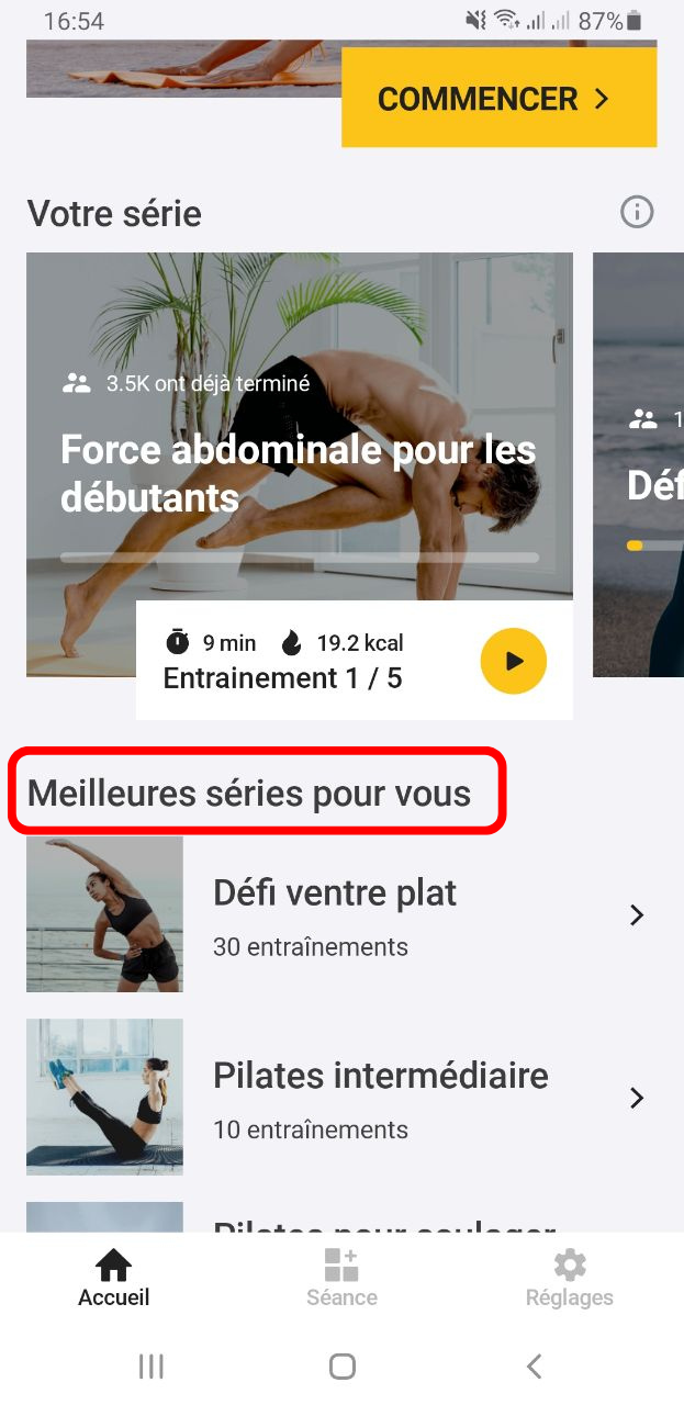 Si vous souhaitez continuer à vous entraîner le même jour pour une séance plus active et variée, vous pouvez faire des exercices de l'unité "Meilleures séries pour vous”. Cela vous permettra de choisir les entraînements les plus adaptés dans notre bibliothèque en fonction de vos zones cibles.