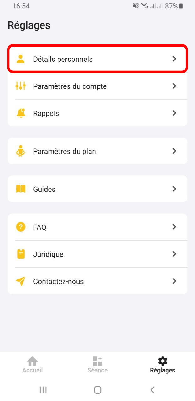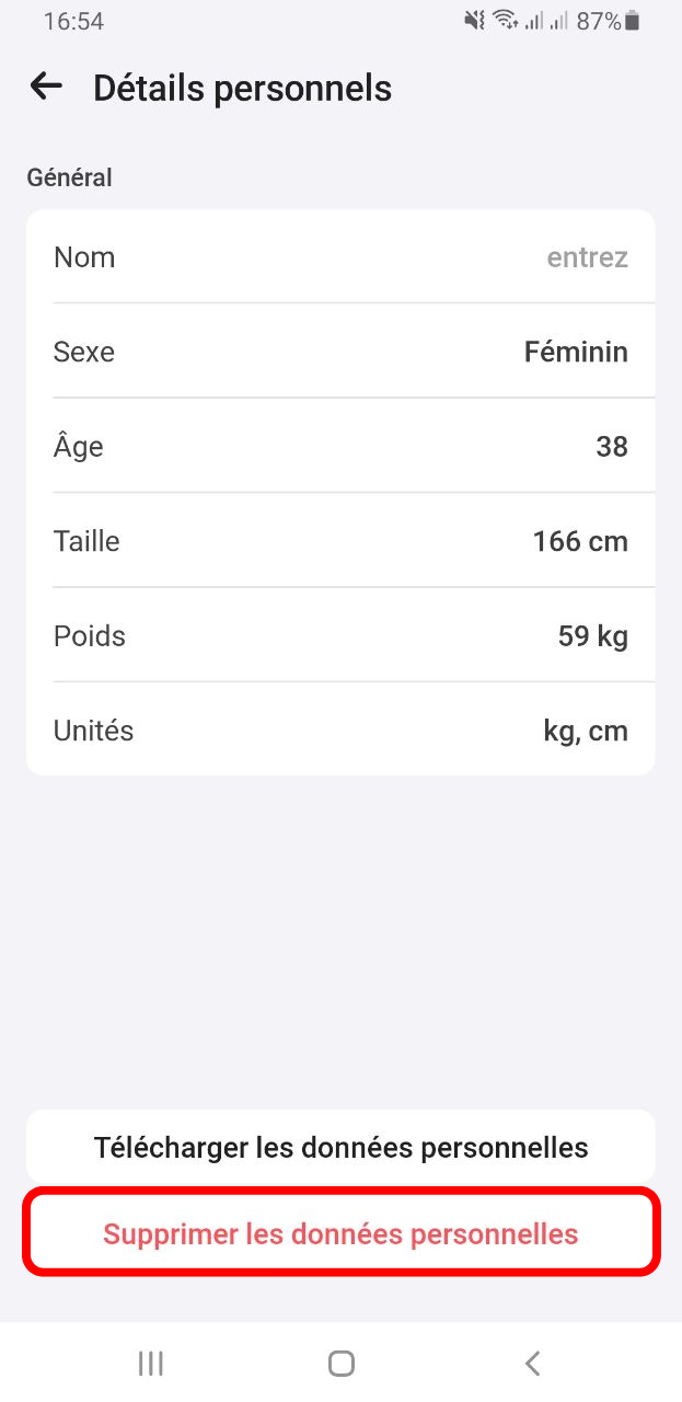 Afin de supprimer vos données personnelles, veuillez vous rendre dans l'onglet 'Reglages', cliquez sur les boutons 'Details personnels'