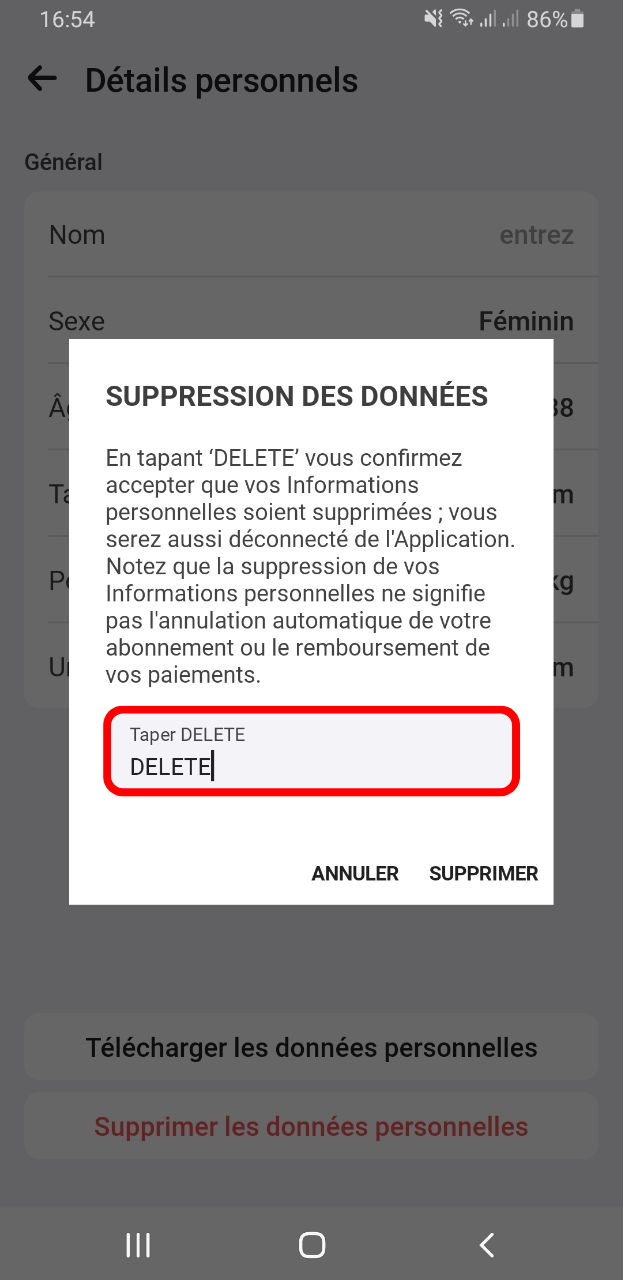 Veuillez noter que la suppression des données personnelles entraînera la résiliation de l'abonnement. De plus, permettez-moi de mentionner que si vous souhaitez continuer à utiliser l'application jusqu'à la fin de la période de facturation, vous devez contacter l'équipe d'assistance pour obtenir de l'aide pour retrouver l'accès à votre compte.