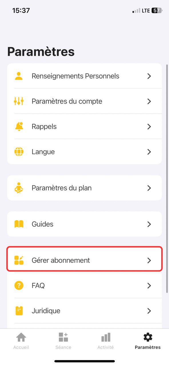 Nous détestons vous voir partir, mais si vous devez annuler votre abonnement, veuillez aller à l'onglet “Paramètres” de l'application et appuyez sur “Gérer abonnement”:
